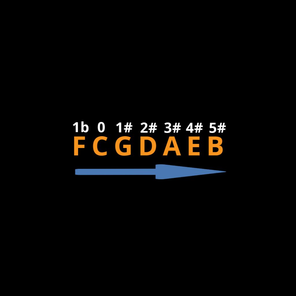 Now let’s say we are in the key of D. We know that D has two sharps in its key. To figure out what sharps they are, we simply go back to the F and count the first two letters (F being the first one). We end up with F & C, we simply add sharps to them and BOOM, we have the sharps that are in D major, F# & C#.